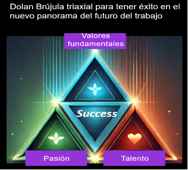 Como marco general utilizamos la brújula triaxial para tener éxito en el nuevo panorama del futuro del trabajo, partiendo de la siguiente hipótesis: aunque tu talento y las competencias asociadas son la llave, existen dos condicionantes adicionales para el éxito: tu brújula interna, representada por tus valores fundamentales (pocos, pero esenciales), y tu pasión. Sin pasión, ni tu talento ni tus valores serán sostenibles.
